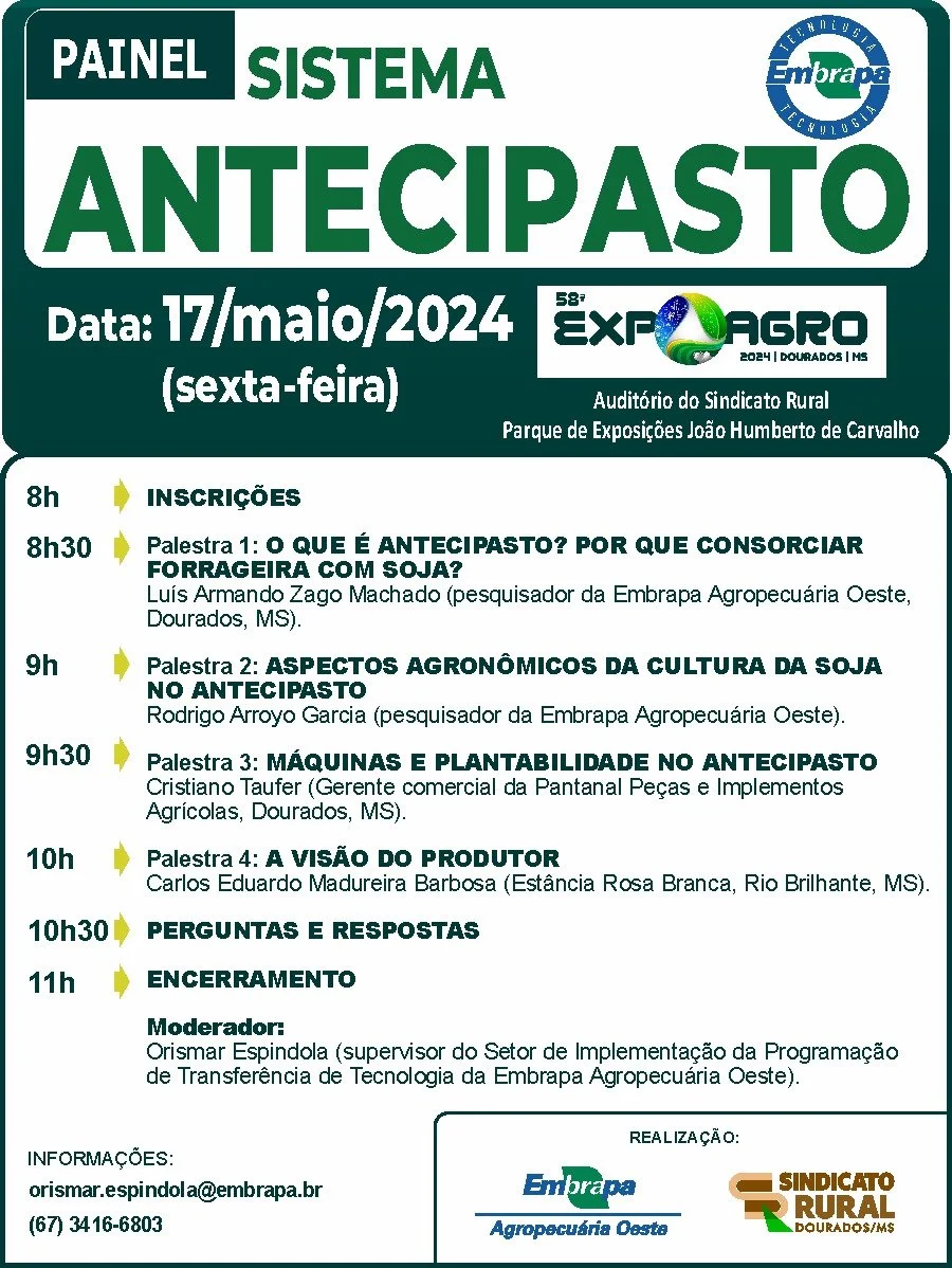 Uma oportunidade única para produtores rurais, profissionais da assistência técnica rural, pesquisadores e professores acontece durante a 58ª edição da Expoagro. Trata-se do Painel: Sistema Antecipasto. A atividade faz parte da programação da Expoagro, e acontece na sexta-feira, 17 de maio, das 8h às 11hs, no auditório do Sindicato Rural de Dourados.
